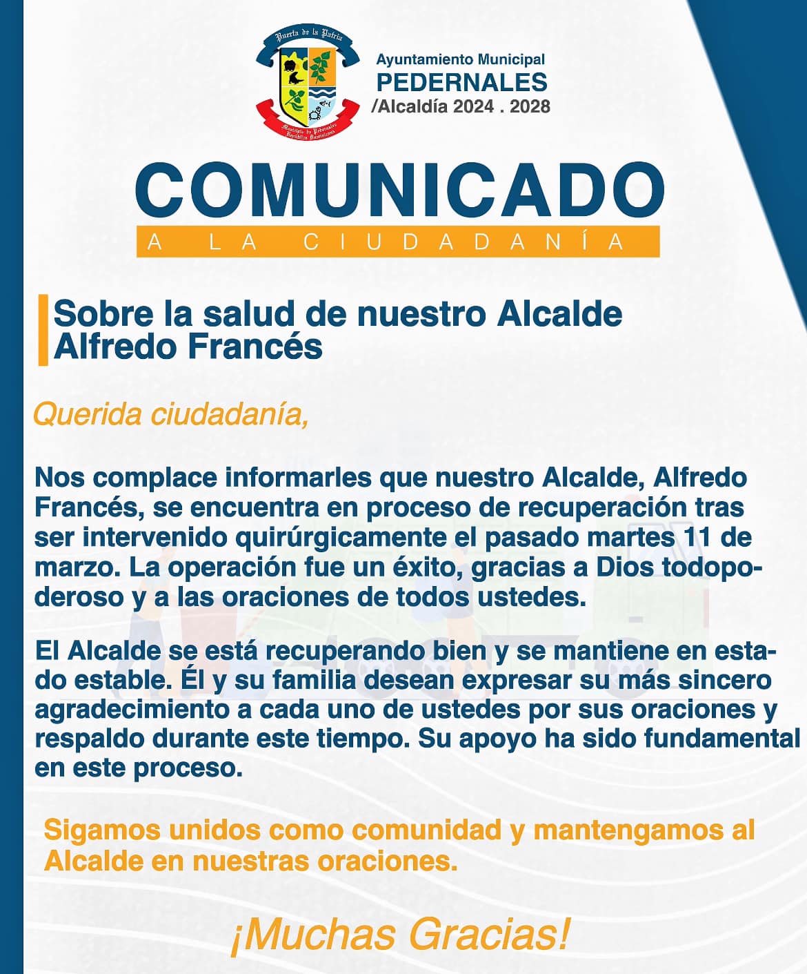El Alcalde y su familia desean expresar su profundo agradecimiento por las muestras de apoyo, las oraciones y los mensajes de aliento recibidos. Su respaldo ha sido fundamental en este proceso de recuperación.