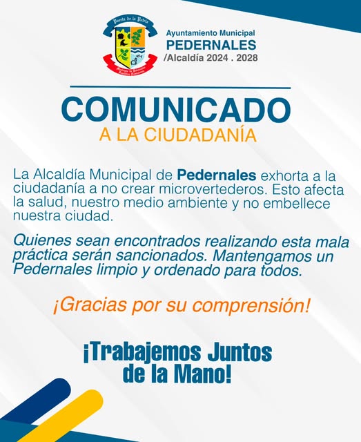 La Alcaldía Municipal de Pedernales exhorta a la ciudadanía a no crear microvertederos. Esto afecta la salud, nuestro medio ambiente y no embellece nuestra ciudad.