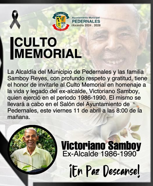 La Alcaldía del Municipio de Pedernales y las familia Samboy Reyes, con profundo respeto y gratitud, tiene el honor de invitarle al Culto Memorial en homenaje a la vida y legado del ex-alcalde, Victoriano Samboy, quien ejerció en el periodo 1986-1990. El mismo se llevará a cabo en el Salón del Ayuntamiento de Pedernales, este viernes 11 de abril a las 8:00 de la mañana.